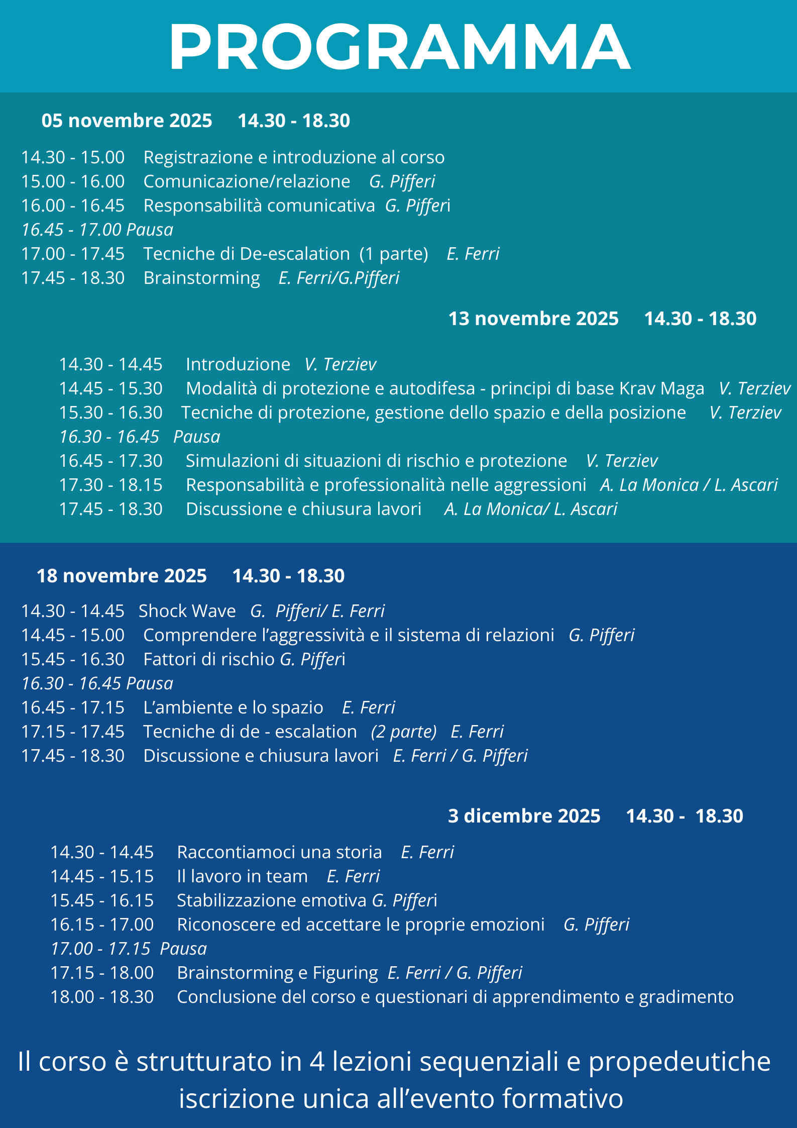 Corso accreditato (9,5 crediti) e gratuito dal tema “Oltre il conflitto – Gestire relazioni, tecniche di de-escalation e di protezione”. Il corso si svilupperà in 4 giornate (5/11 – 13/11 – 18/11 e 3/12), l’iscrizione è unica per tutte le 4 giornate.
